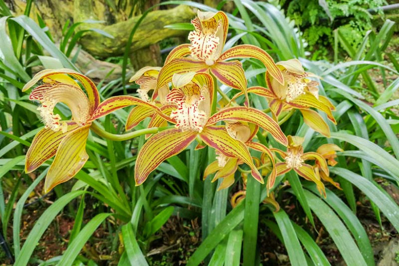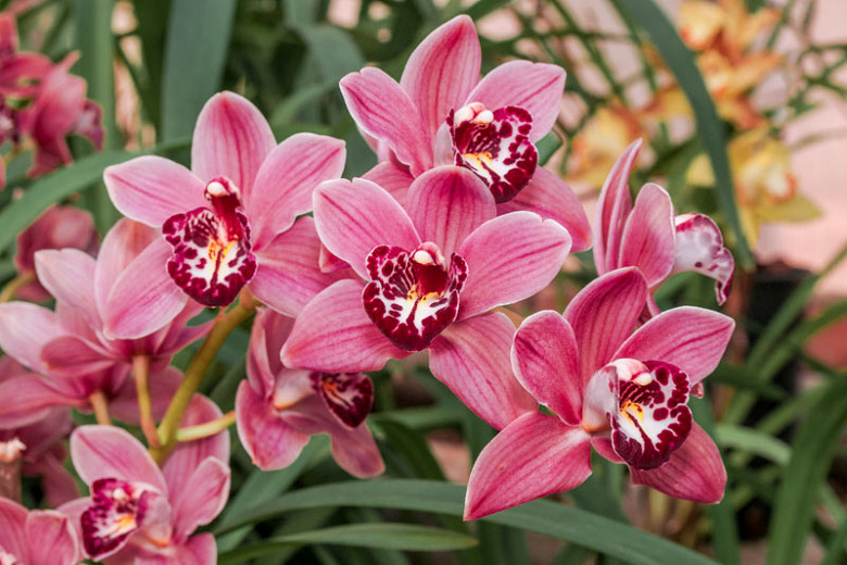 • Characteristics: Though appearances differ between species, Cymbidium orchids generally have thick, tubular roots and long, leathery leaves which grow close to the base of the plant. These orchids also have pseudobulbs (thickened storage organs) which show up as a swollen area near the base of the plant. Flowers emerge on spikes in groups of around 10, though some species have singular flowers. Flowers differ from species to species in both color and shape, though most have five petals and a three-lobed labellum. Flowers are long-lived for orchids, lasting up to 10 weeks.